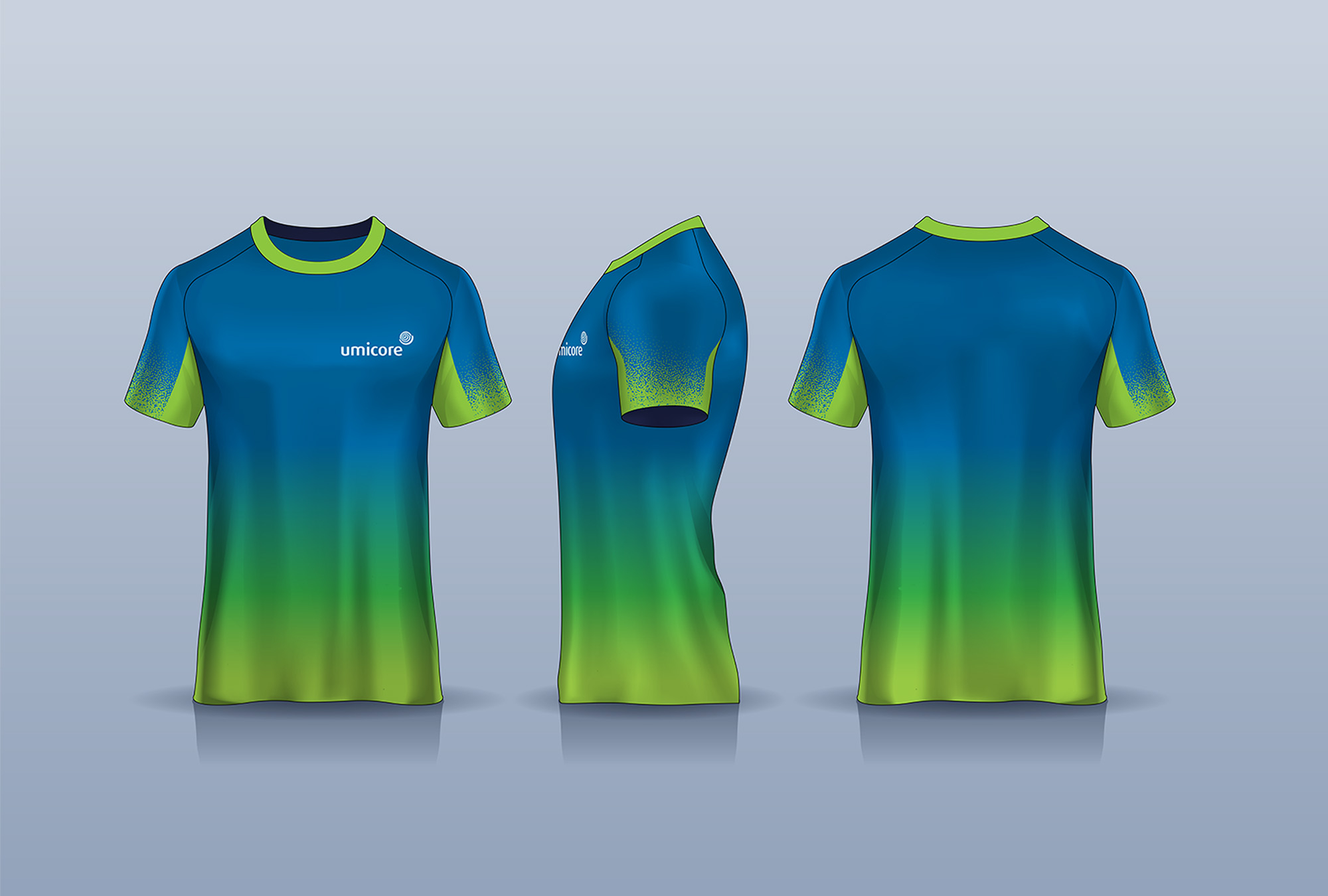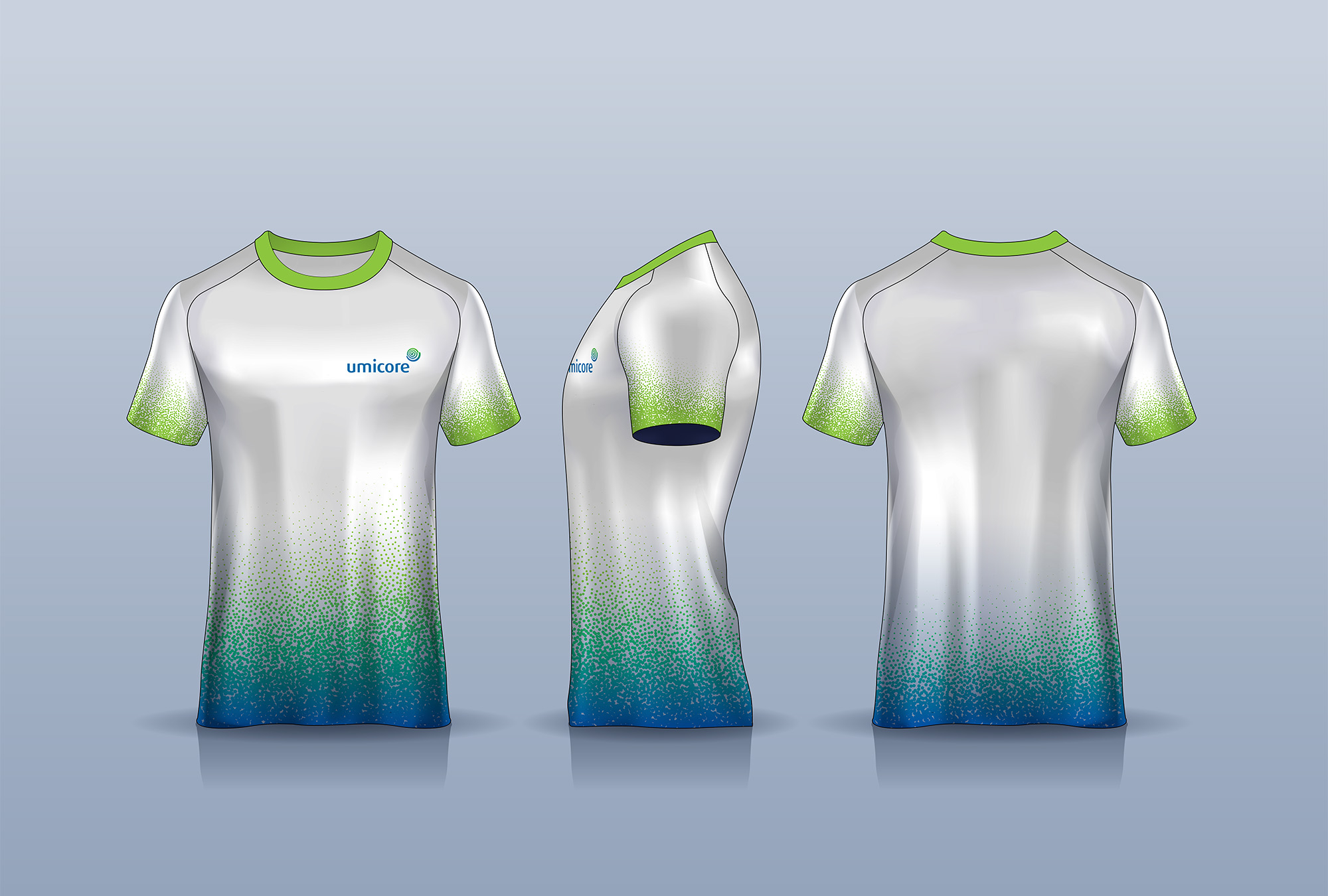 Choose colors that are contrasting and complement each other. For light-colored articles, including fluorescent colors, use the black Umicore logo to increase visibility. For darker articles, such as a blue uniform, use the white Umicore logo. Colored logos should not be used against dark backgrounds. For white articles of clothing – typically only used for t-shirts – use the black or colored Umicore logo. The use of a black logo in these instances will reduce cost. The colored Umicore logo can be used to increase brand awareness and recognition.