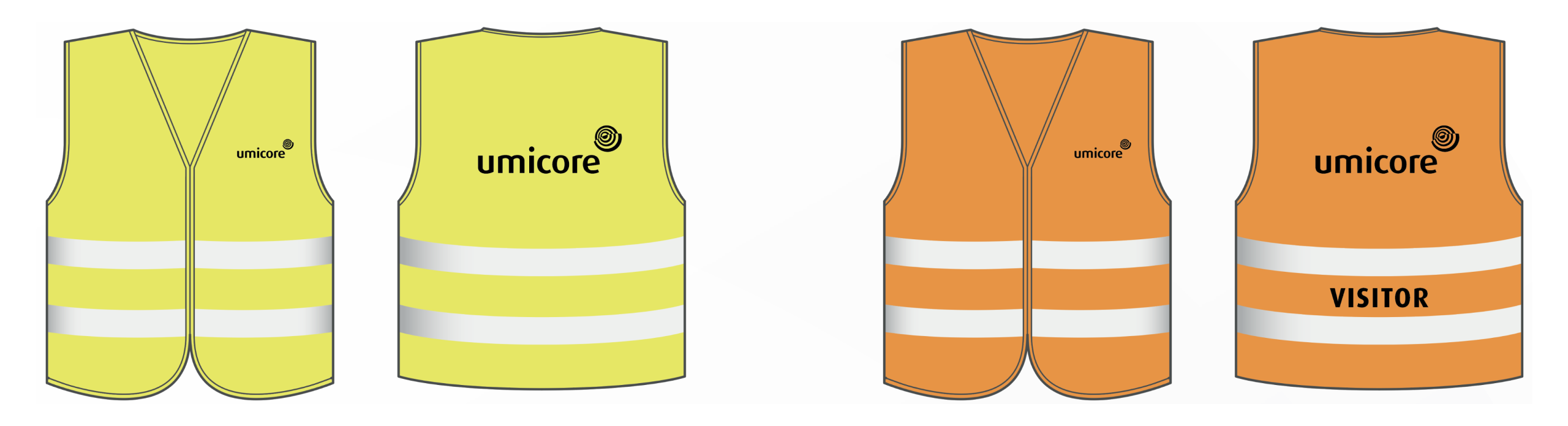 For Umicore vests, two options are available. Site vests for Umicore employees should be presented in yellow with black logos. Logo placement should be consistent with all other articles, using the heart placement on the front and the larger, central placement on the back.