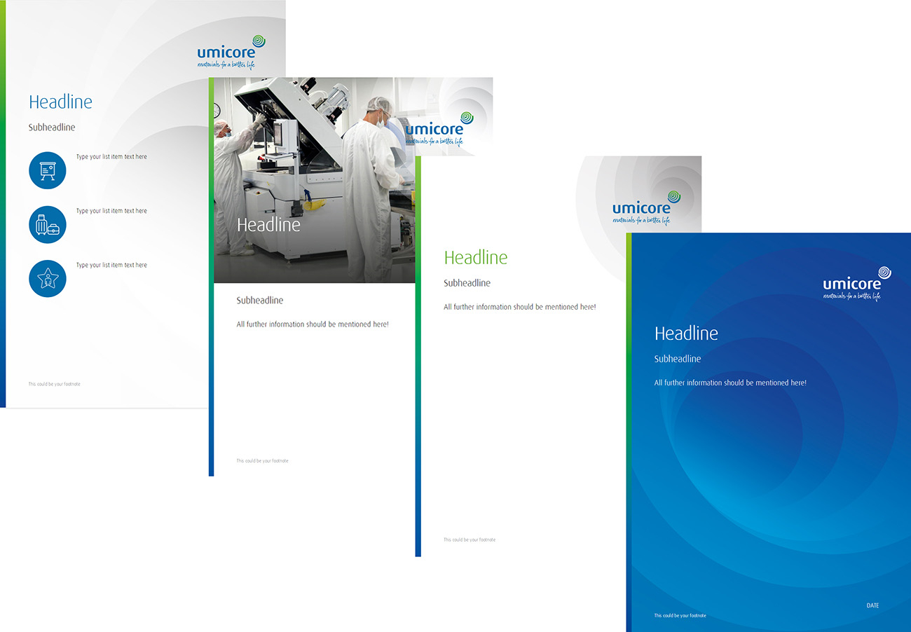 Posters should always use the Umicore logo featuring the handwritten strapline ‘materials for a better life’. The position and size of the logo, as well as the graphic devices should follow the guidelines in place.