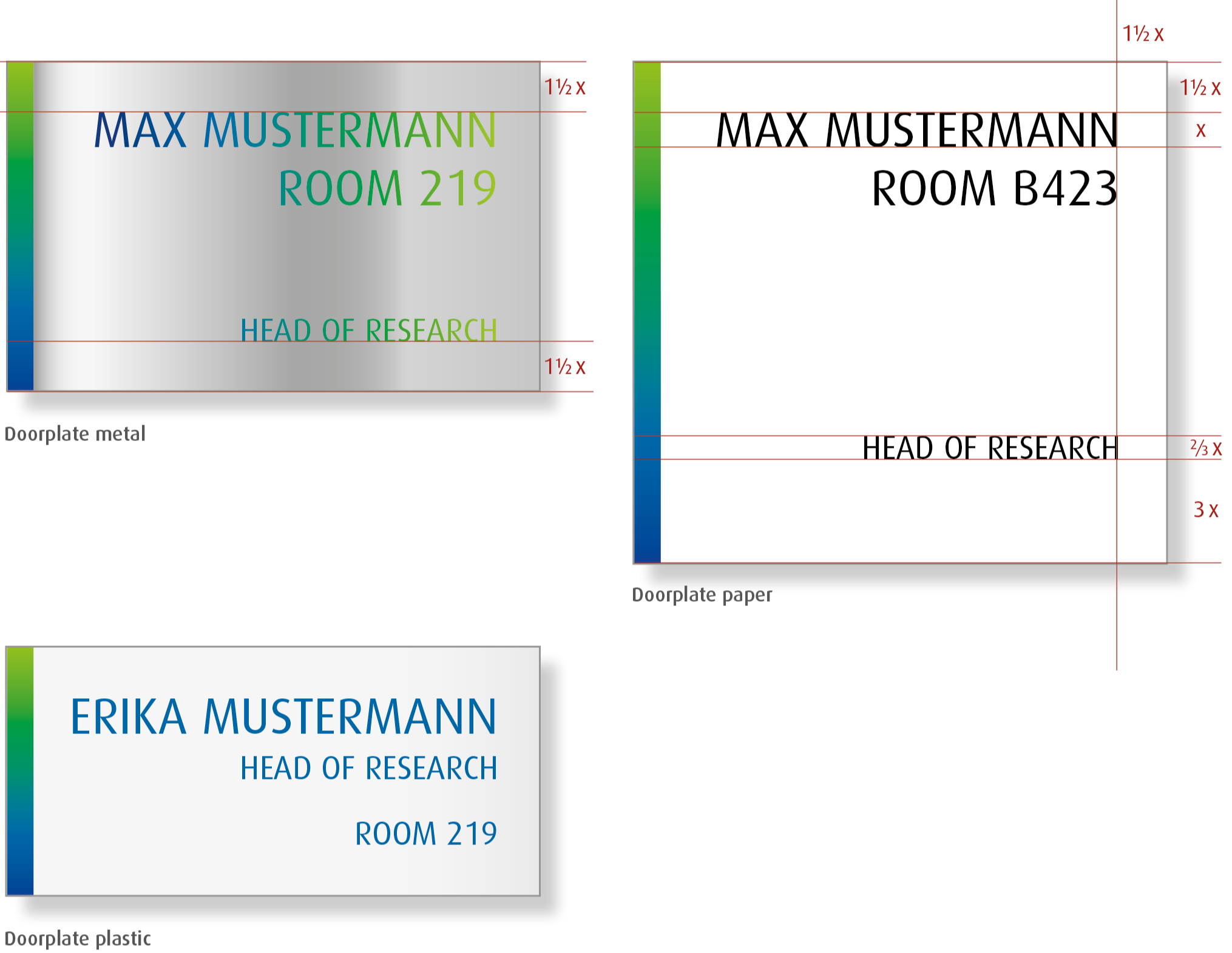 The doorplates should fit in the existing orientation system of the building. Therefore it is very flexible in the design. The use of the gradiant is obligatory.