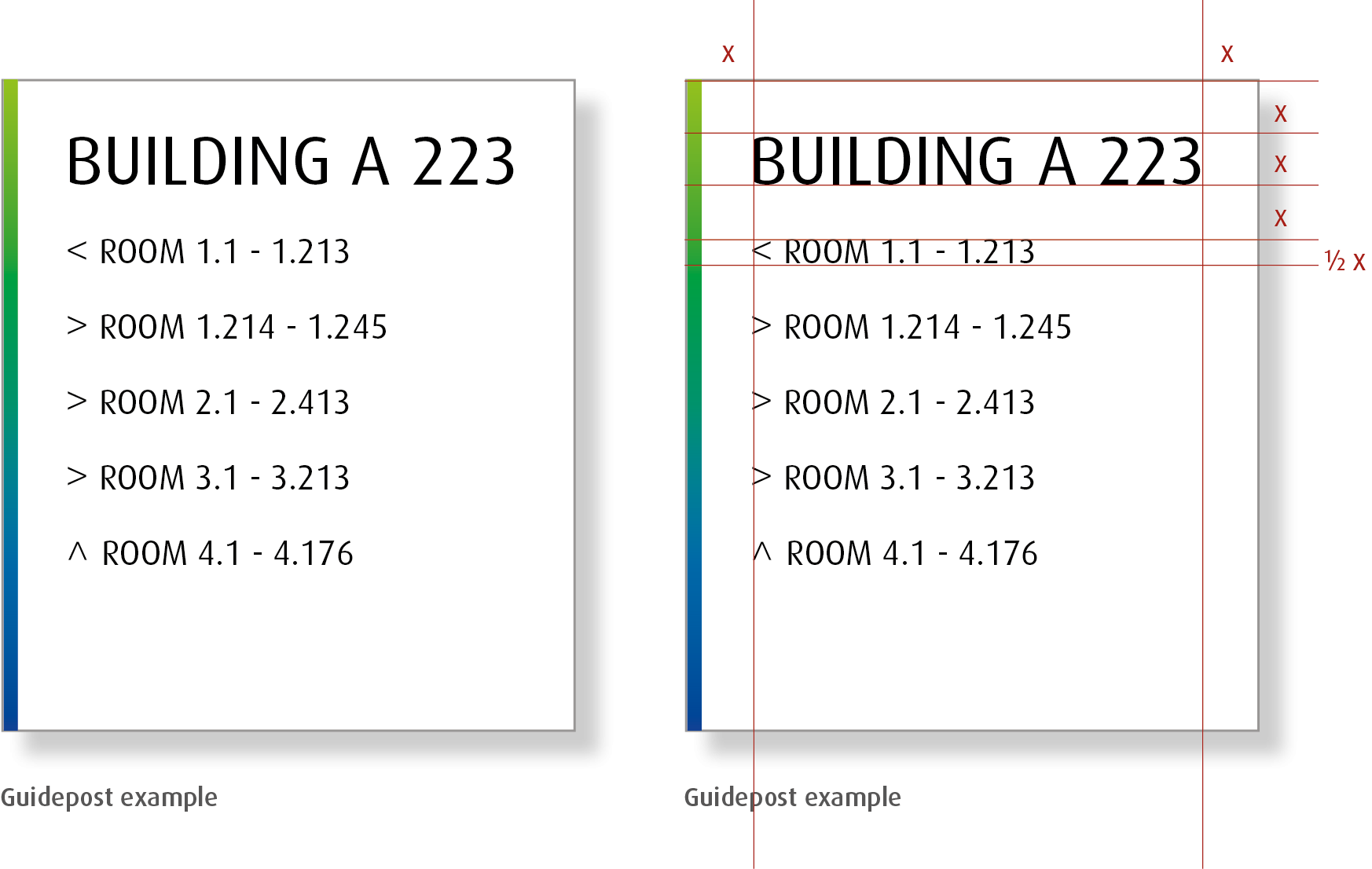 - Always ensure size of information is appropriate for particular sign type. See the examples for different requirements. The arrow is easily set as the „<“ and „>“ of the typeface Dax. The size of the arrow is the same as the lower cases