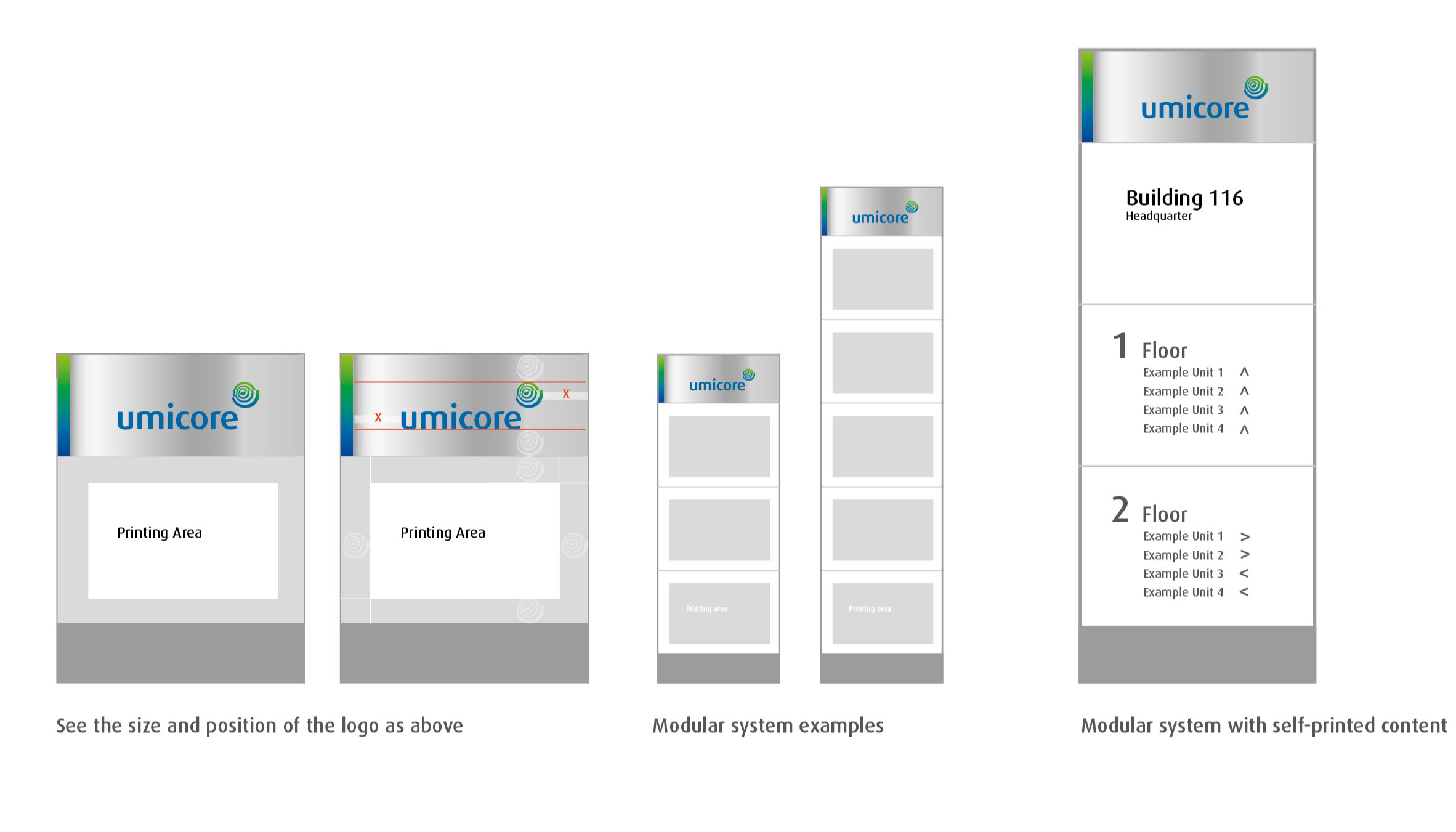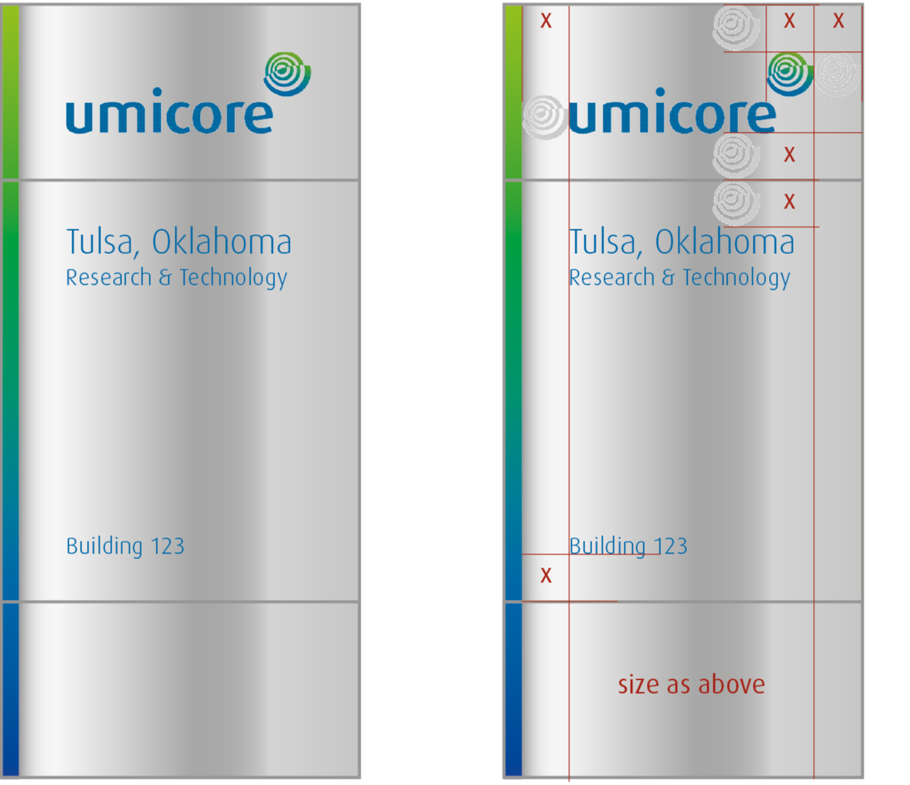 To ensure information is easy to read, the base color of all signs should be Umicore metal, with information in Umicore blue.