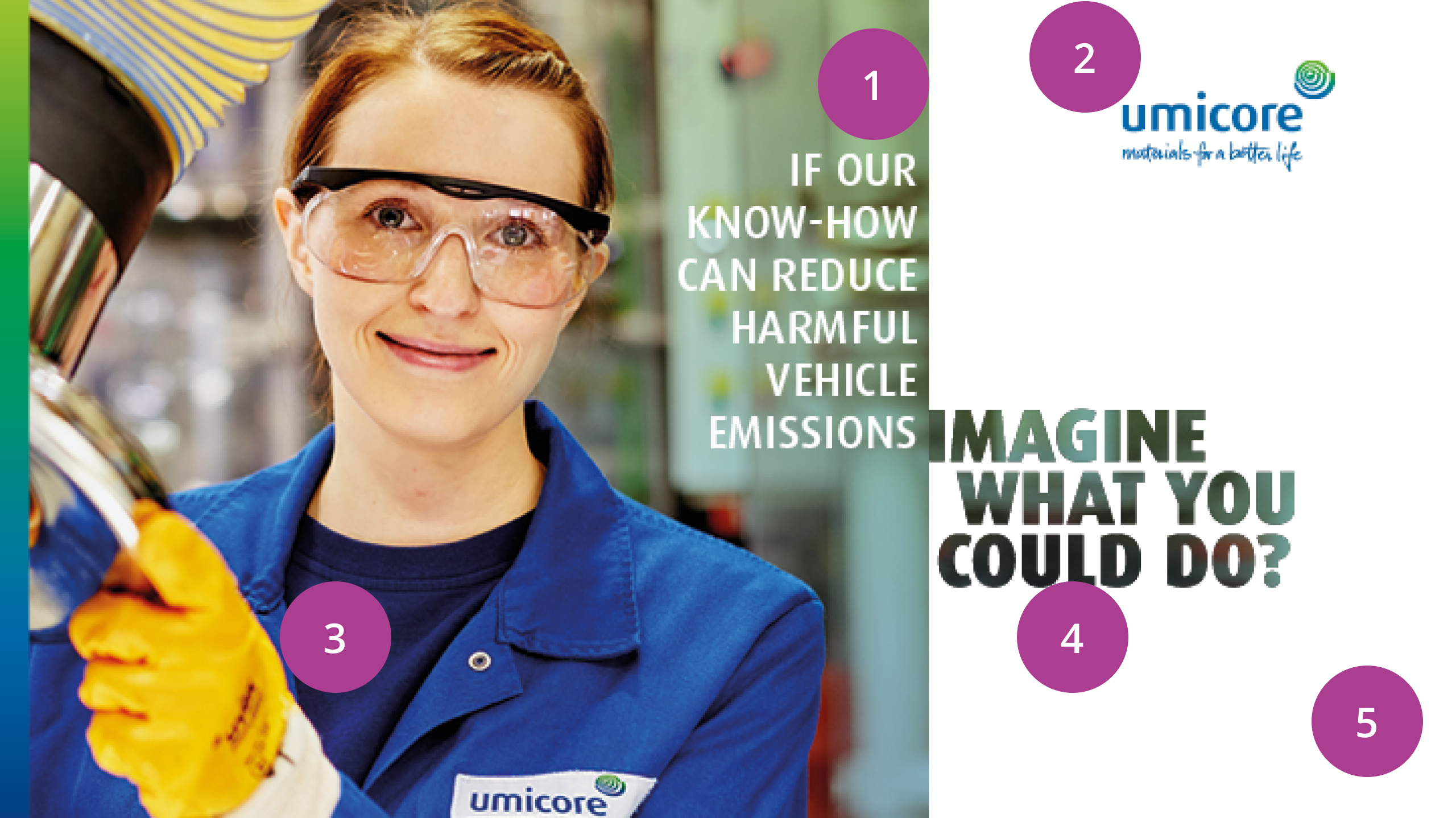 Central to our concept is a simple headline structure that highlights the work of Umicore and our employees, and then asks Imagine what you could do? The suggestion being ‘what could you achieve in this kind of environment/with this kind of technology/with these kind of skills/with this kind of organisational ambition?’.
