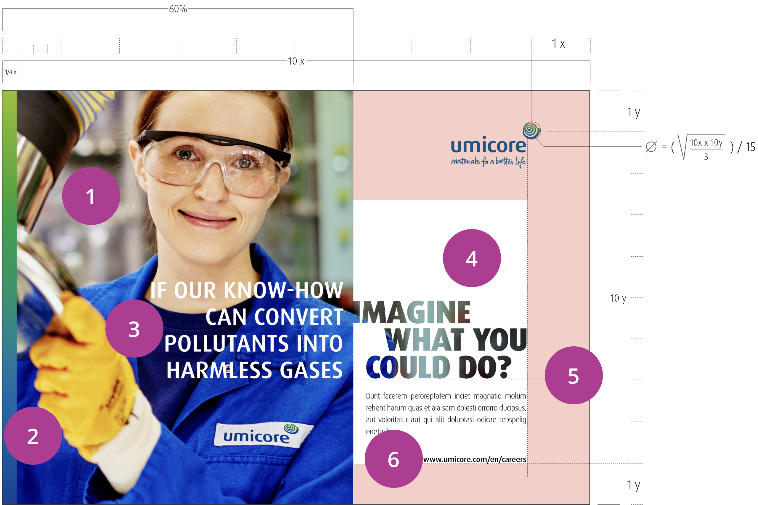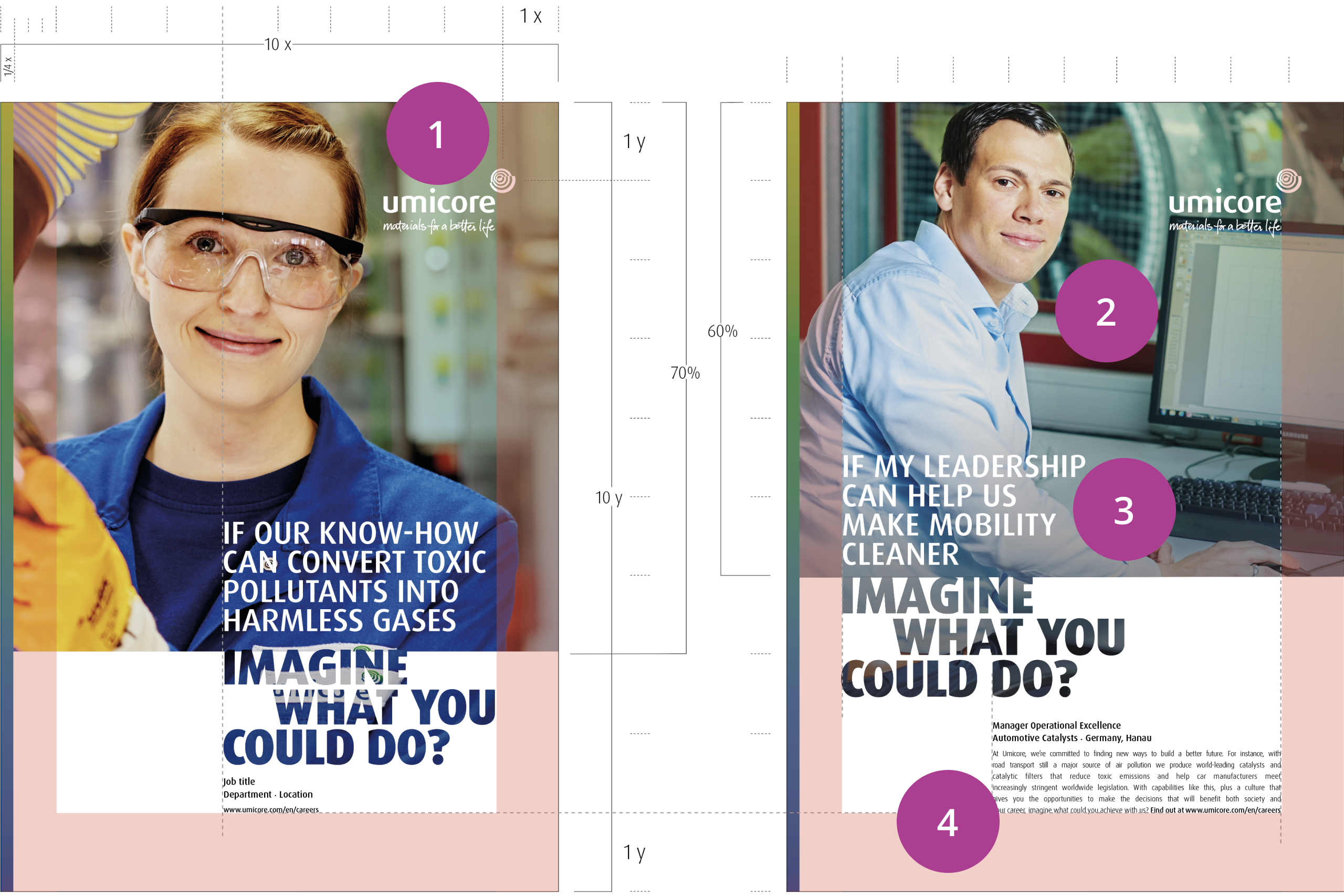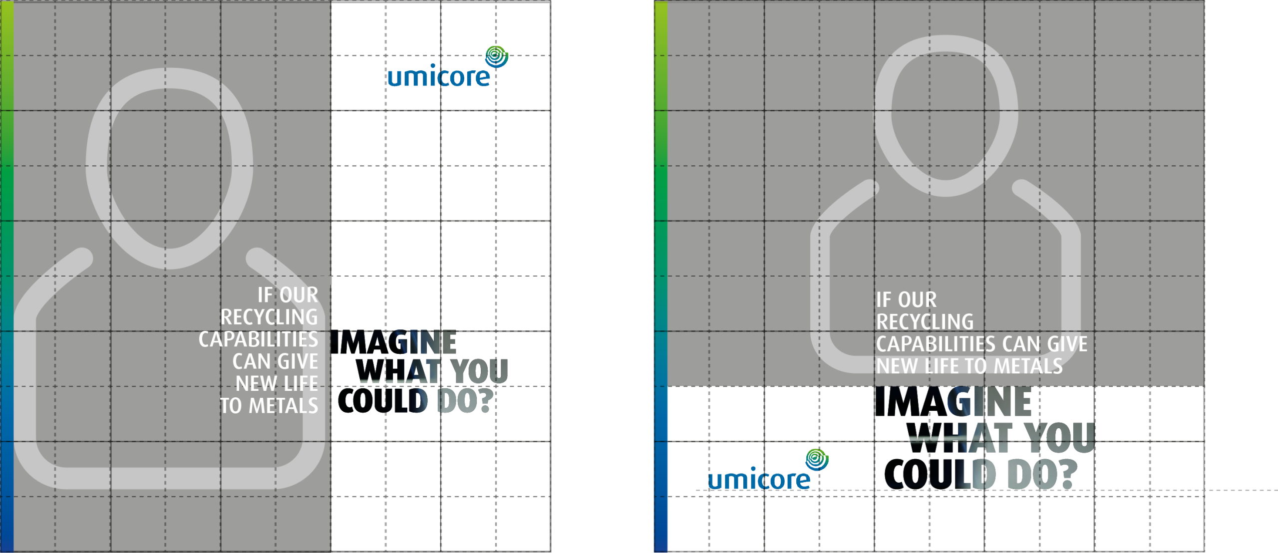Imagine what you could do? takes a warm, authentic visual approach and combines it with provocative messaging. It adopts a split-device that features the employee/s on the left side of the communication (or top in portrait communications) with the first part of a headline that references Umicore’s specialisms and capabilities. On the right (or bottom) Imagine what you could do? sits on the whitespace – alongside body copy if required and should start at the height of the last line of the headline.