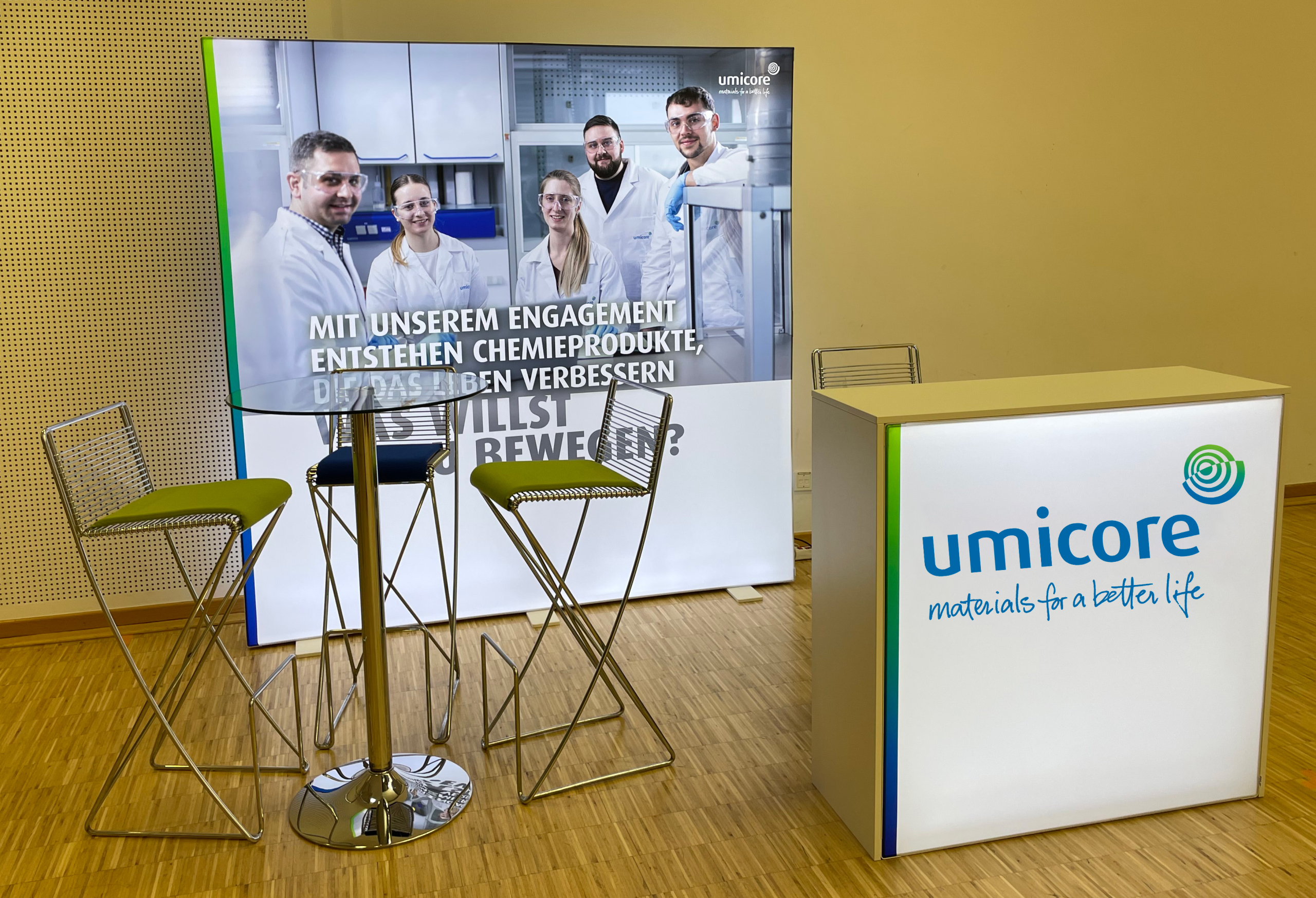 Job fairs and events provide an excellent opportunity to talk face-to-face with active jobseekers about Umicore. Most of these events require a System Stand Solution or a Mobile Stand like a pop-up & roll-up stand. The main role of those stands should be to catch someone’s eye, and entice them to chat.
