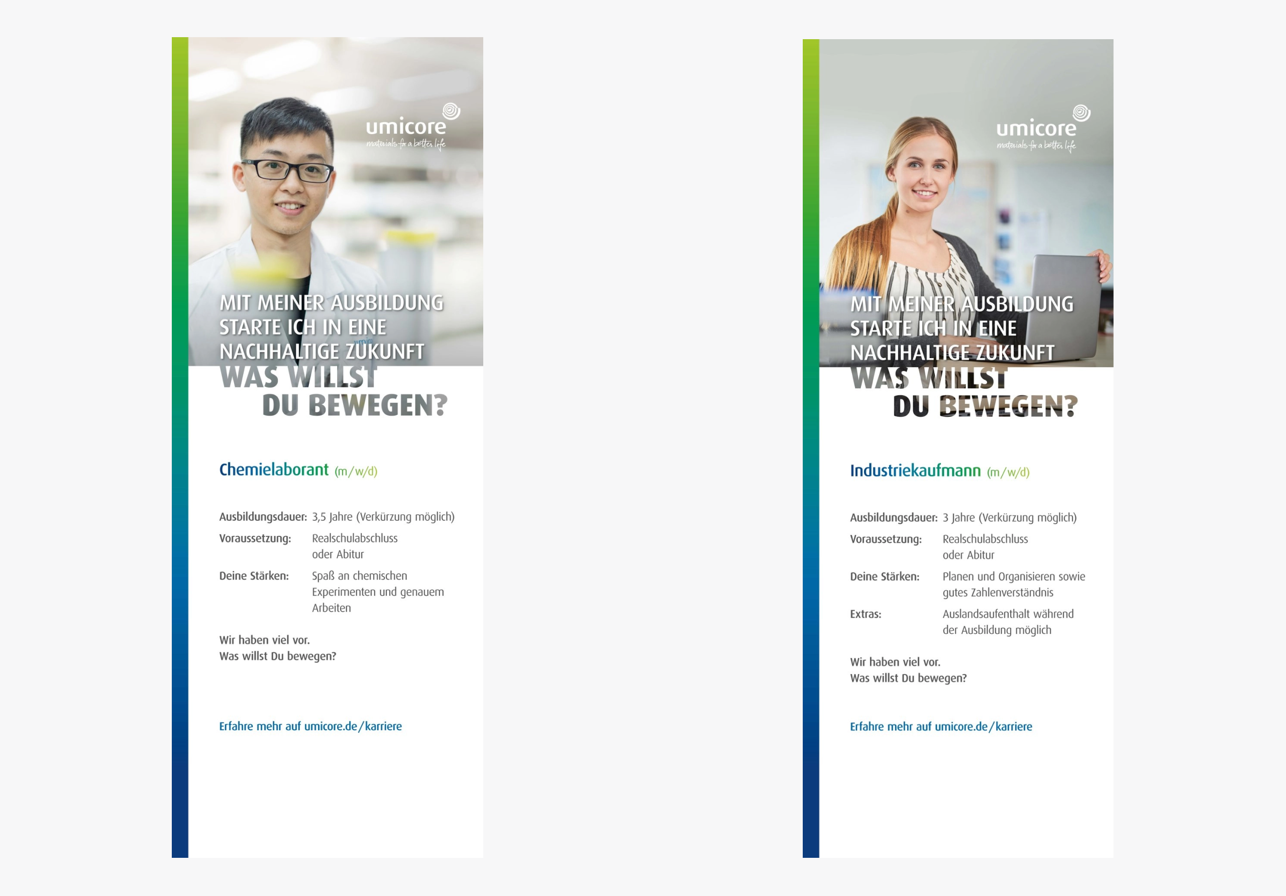 The layout for these Job Fairs should follow our Employer Brand. It should feature the headline, image and the fact that we are hiring. Our URL can be placed in Umicore blue on the white space at the bottom left, but still in a readable height or a QR Code can be used.