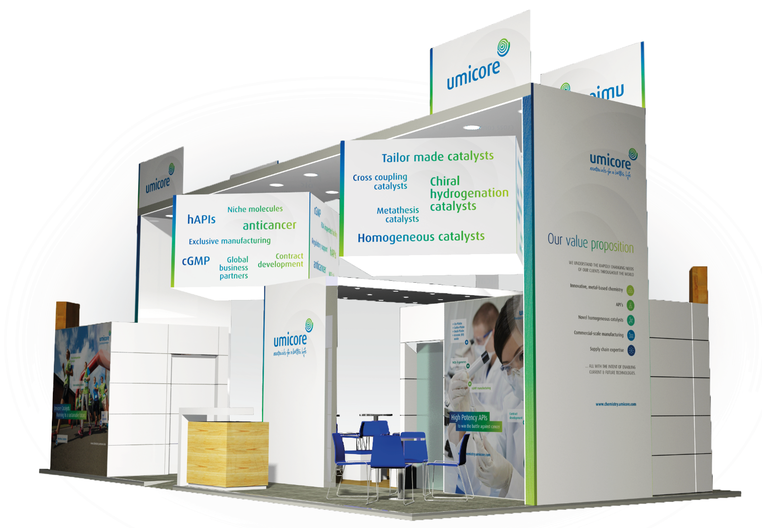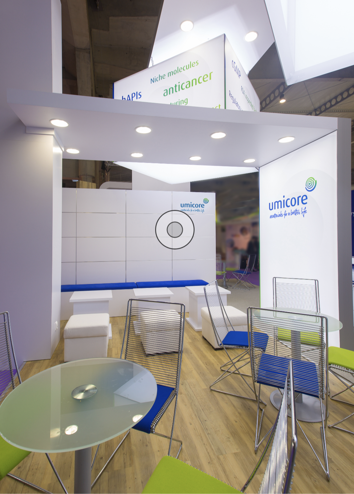 Within the trade show concept, the main Umicore colors white, green and blue are the dominant colors. By using different color carriers (paper, MDF, textile, acrylic) possible color variations should be tested in advance and reduced to a minimum.