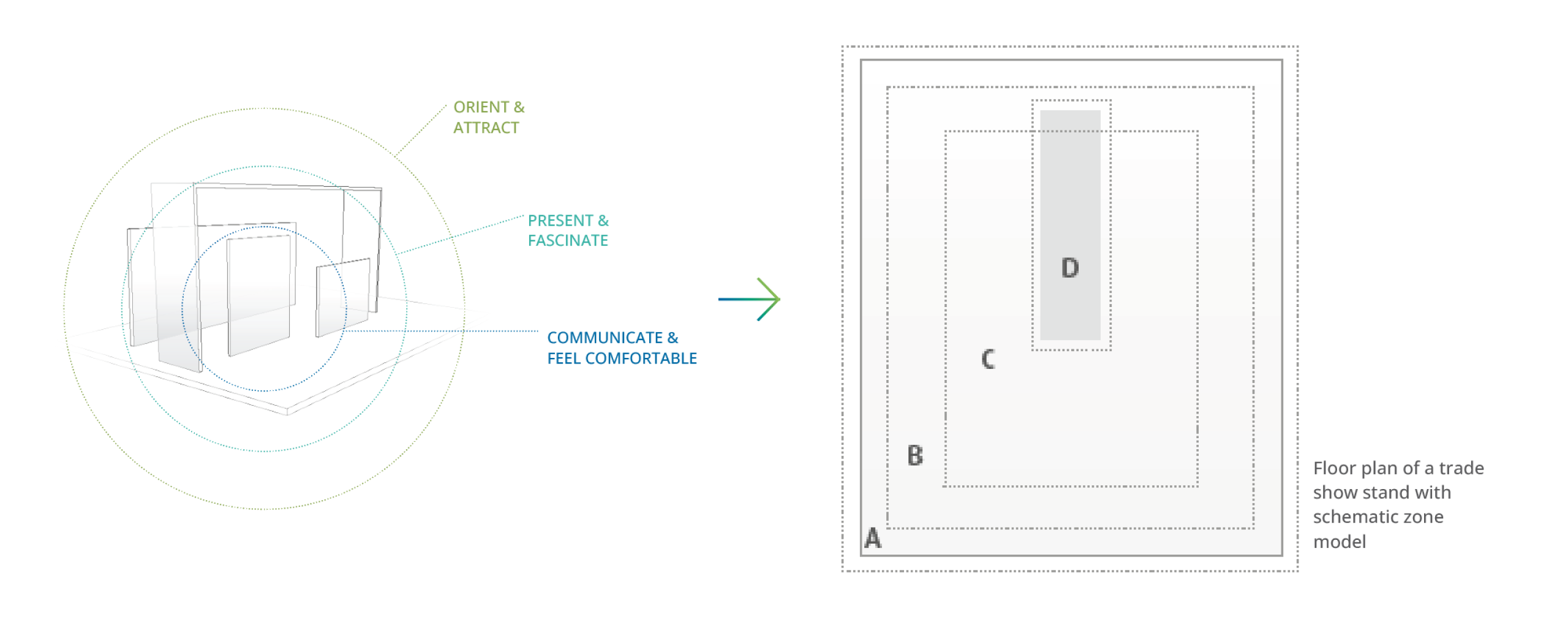 In order to concentrate on the basic needs of the visitor and of the business, the trade show concept creates defined stand areas. The layout and the weighting of their interaction can vary.