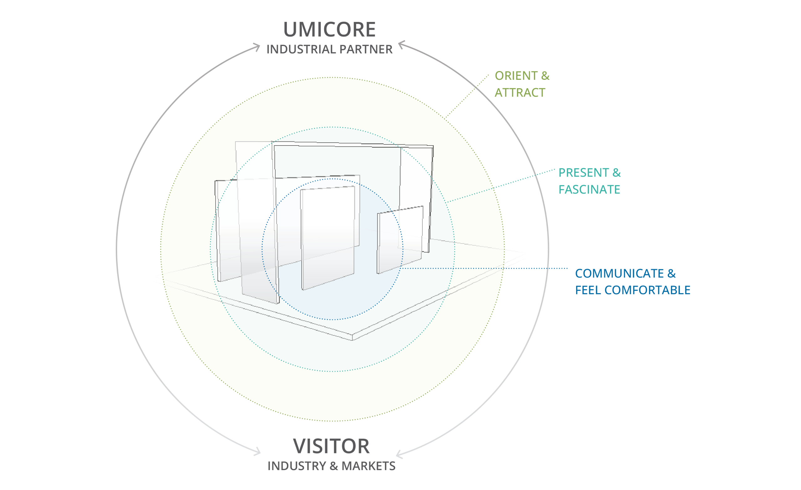 The implementation of the Concept allows for an international consistent trade show appearance regardless of the size of the stand and at the same time offers defined rooms and platforms for different orientation, presentation and communication needs. Along with economic and logistic considerations, the objectives represented below play a fundamental role in the provision of the trade show concept.