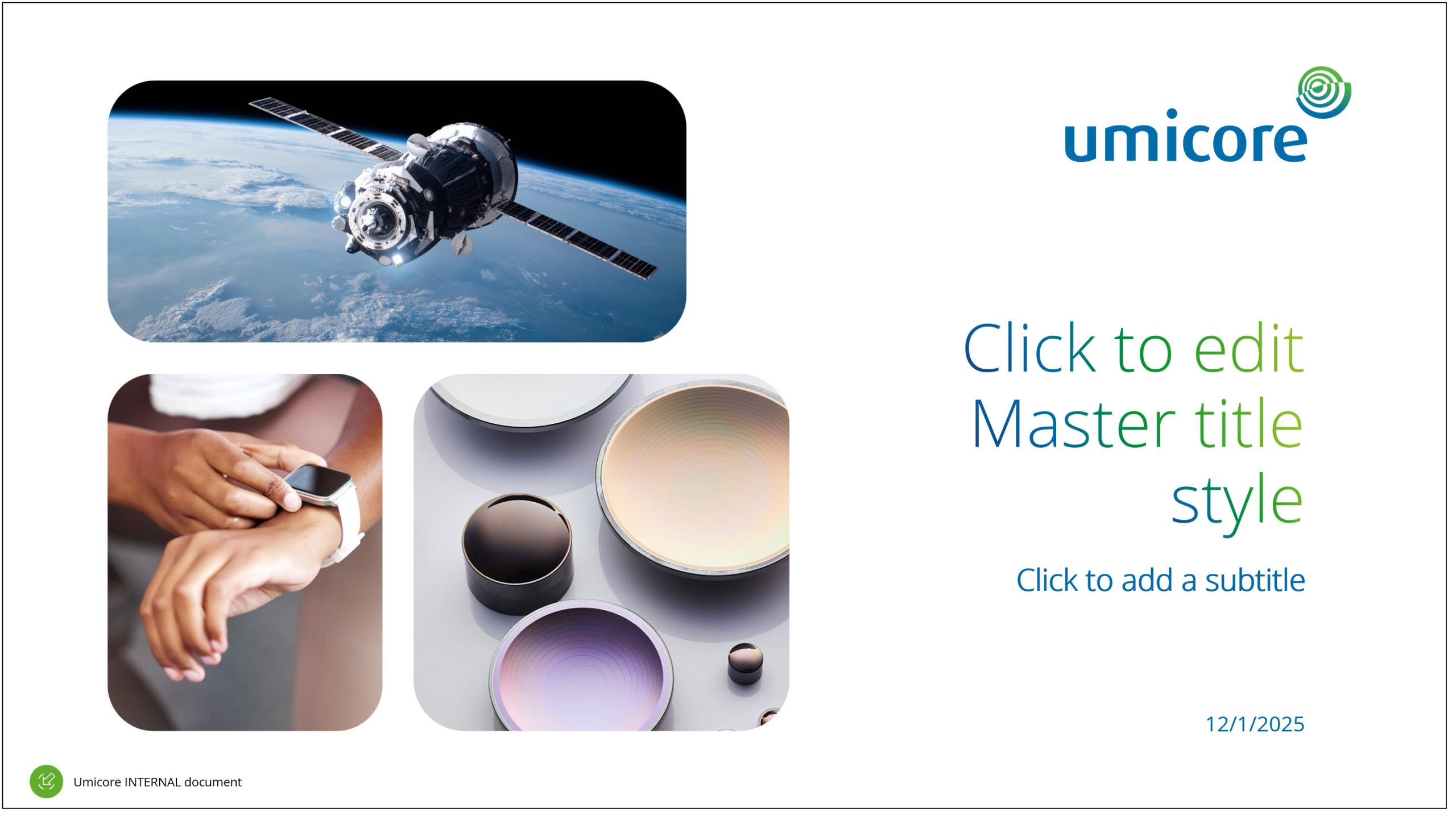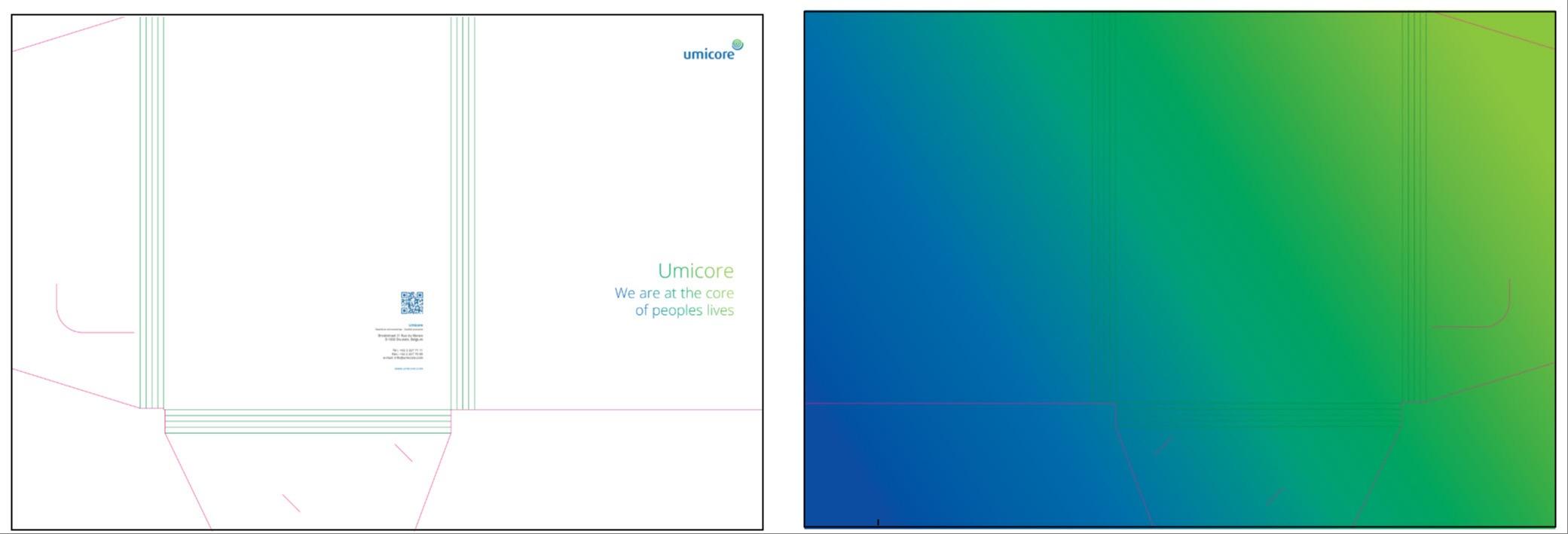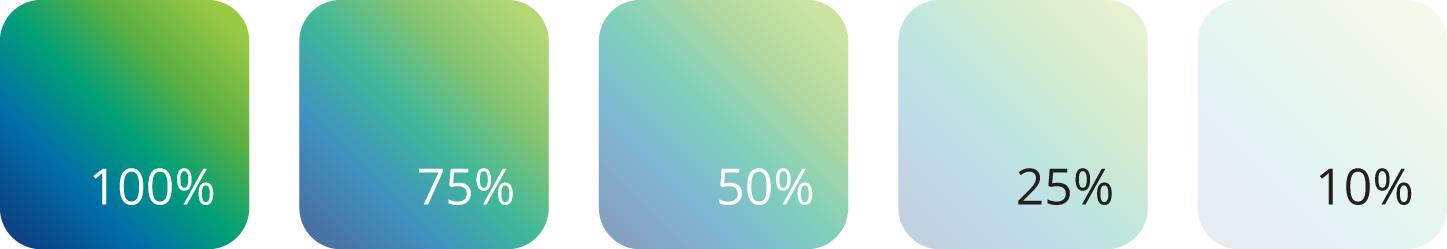 Secondary colors are derived from the color palette within the spectrum from Umicore green to Umicore blue, otherwise known as a “gradient from green to blue”.