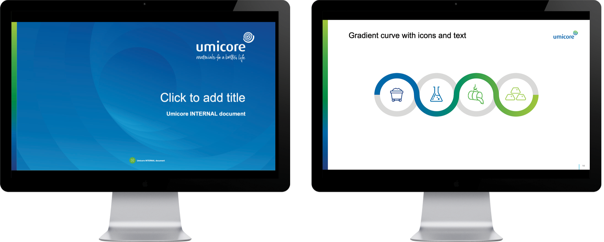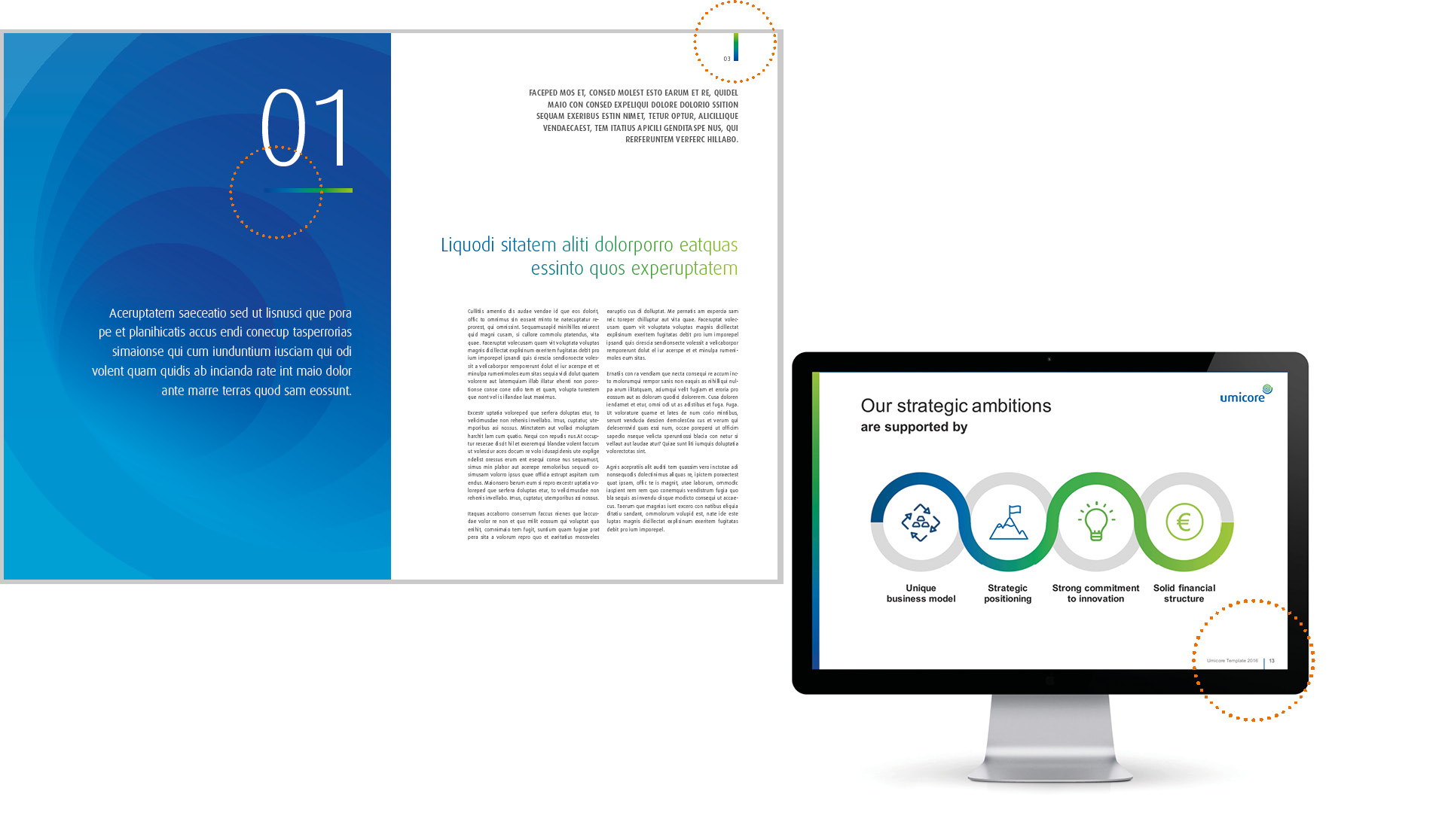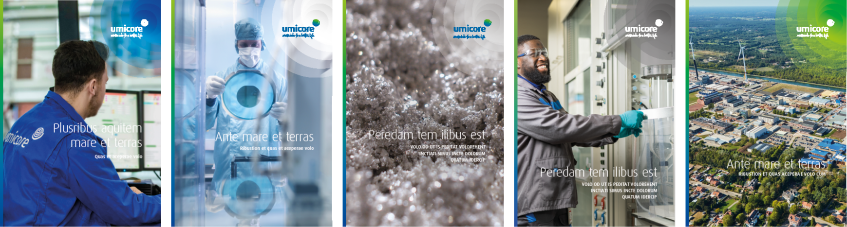 The Umicore visual identity features a graphic device called “gradient-spine” to help build a unique, recognizable, and consistent style across applications.