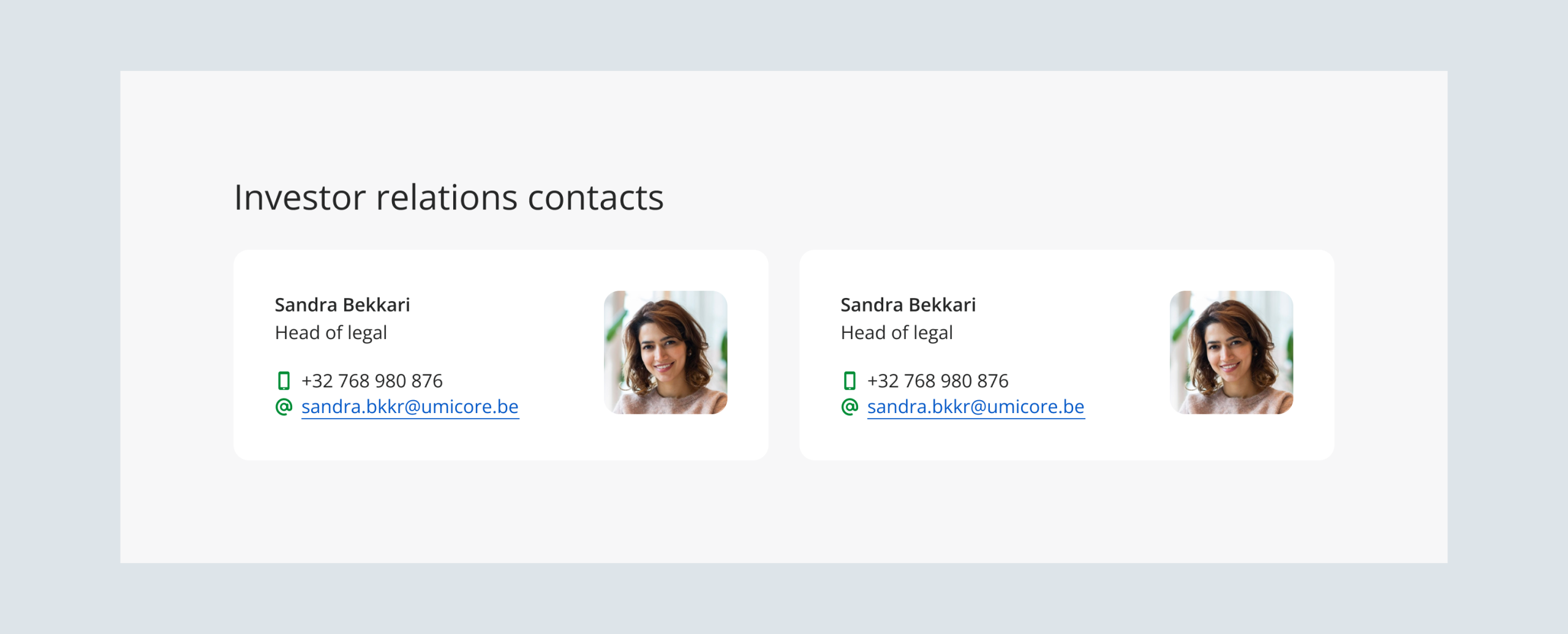 Nearly all pages benefit from a contextual contact solution. This can be a contact form but can also be done with the 'Contacts' component to display contact persons. In this component multiple contact persons can be added displaying their: