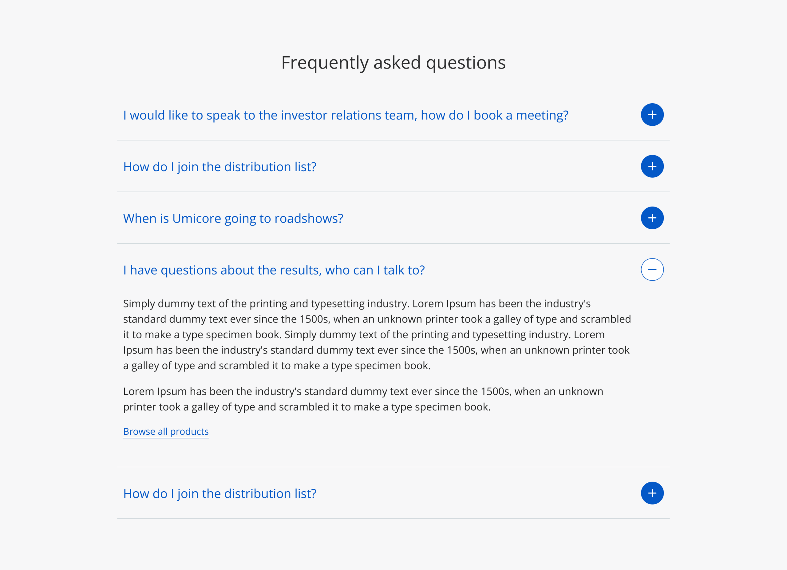 Traditional FAQ component allowing to list multiple questions and anwers. Two variations on this componet exist: