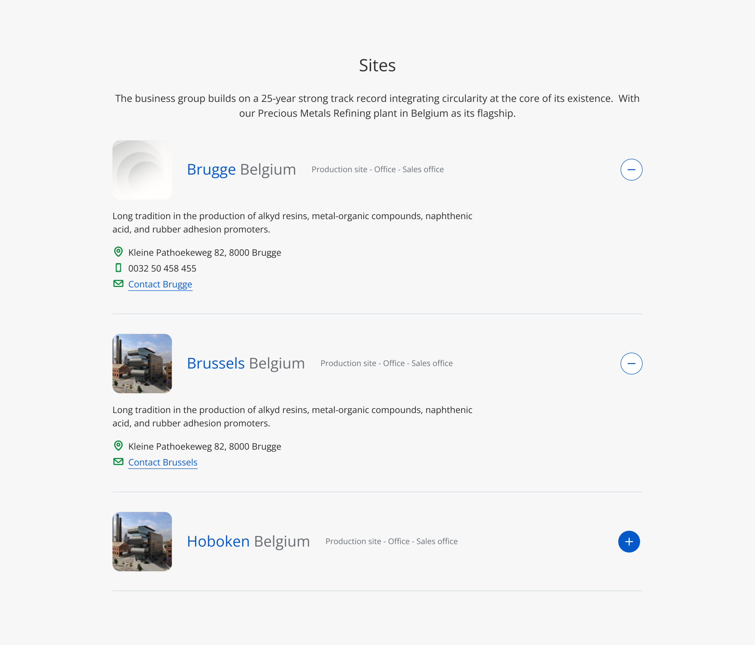 The locations component allows to list a set of Umicore (production) sites, research centers or (sales) offices with their contact details. Selection of the sites is based on tags and allows to show all sites from a specific country, business unit, etc.