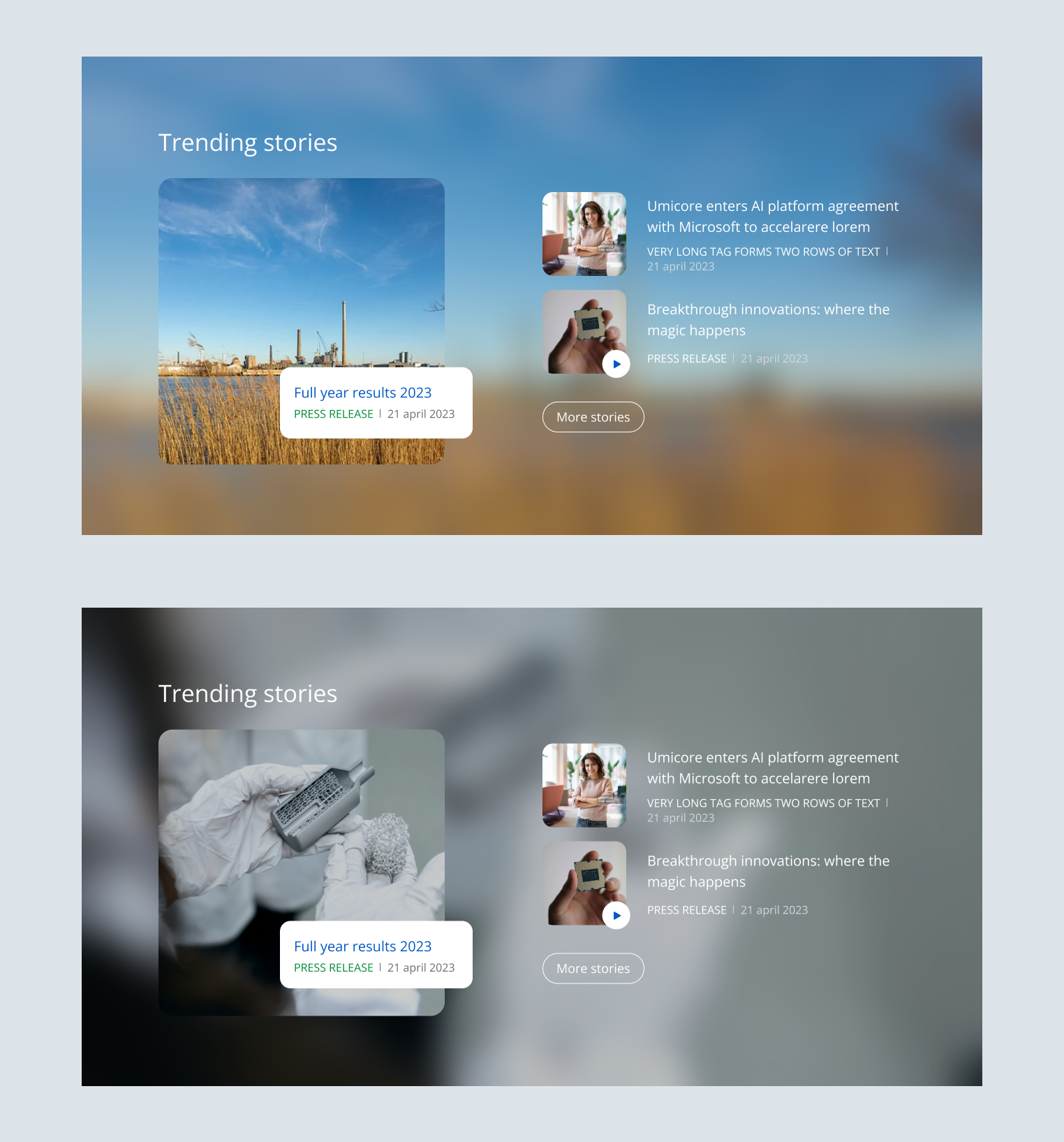 The news spotlight is our most prominent way of displaying a set of news items. It has room for 3 articles in total, of which one large hero item and two smaller ones. The system automatically uses the image of the hero item as a blurred background for the entire component. So please take this in consideration while using this component as a not so great hero image will result in a less appealing result.