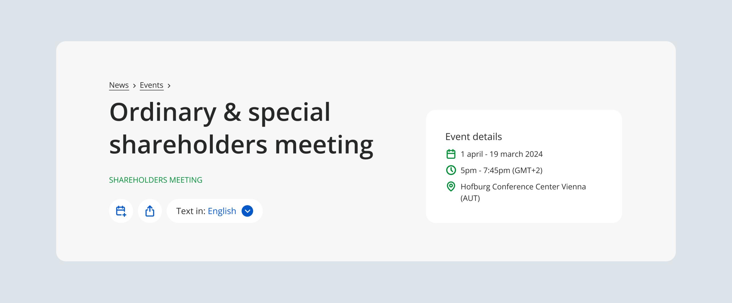 The event header only applies to Event detail pages. All job content is automatically added based on theevent details. The system automatically adds the share options, language switch (if multiple languages are available) and 'add to calendar' button to the header.