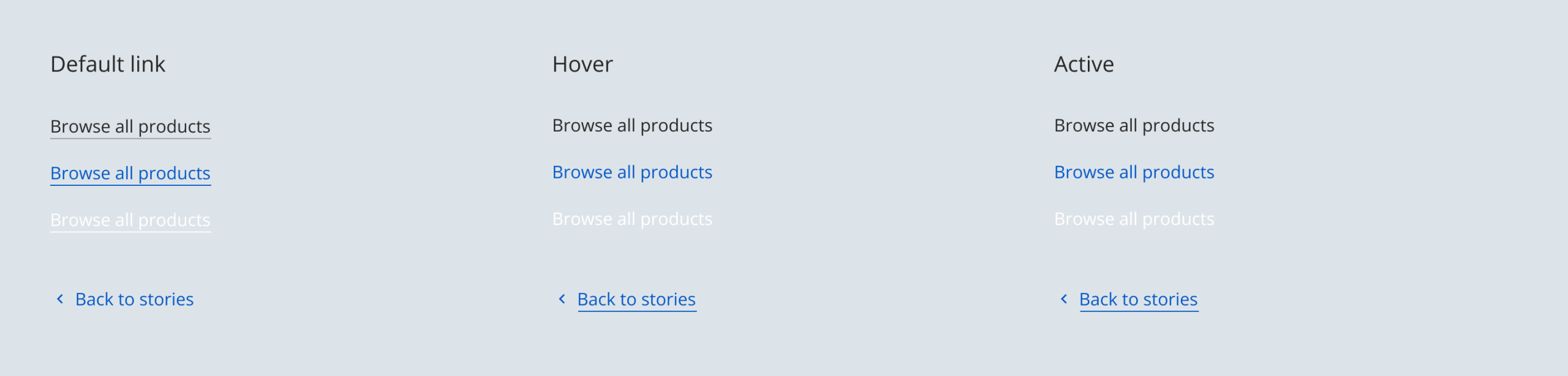 Actions are indicated by text links or buttons depending on its importance. The default link or button is displayed in primary blue but depending on the background it is placed upon variations are provided to ensure readability.